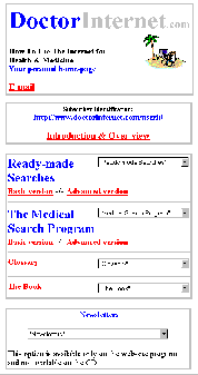 The DoctorInternet Program is constructed with one central purpose in mind. If you want to have the most authoritative and the most current scientific information on any medical subject, in an easy to use, structured approach to information retrieval, then DoctorInternet.com is an essential utility you. Because we want to make sure that your interests will be addressed, if you have any questions about how this program can be useful to you, please feel free to contact us using the e-mail link, above. Obtaining "the most authoritative and the most current information on any medical subject" is fairly straight-forward, in substance, because (although there are tens of thousands of medical-type web-sites) there are only a few primary, scientific sources for this kind of information. But extracting the information that is relevant to your particular interests and staying current on those subjects is difficult, time-consuming, and generally tedious, because the procedures are complex and require specialized expertise. Although the Internet is powerful, capturing that power requires a sophisticated technical interface that is continuously maintained; and that is what The DoctorInternet Program is designed to do for you - i.e., overcome the technical difficulties and get you to the substance, quickly and efficiently. The program has various features which are described below. | ||